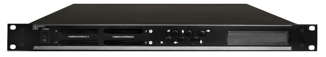 DTN-3 предназначен для приема двух цифровых «стволов» в формате DVB-S (S2) со спутника и декодирования выбранных из них программ при помощи стандартных сменных модулей декодера (КАМов). При помощи встроенного в устройство мультиплексора эти программы могут быть добавлены в транспортный поток, приходящий на вход устройства.