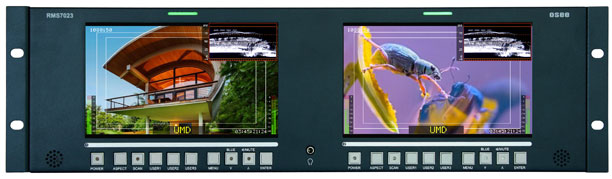 RMx7023 комплектуется качественными TFT-дисплеями с антибликовым покрытием, обеспечивающим вывод видеоизображения с высоким разрешением 800 x 480 при 16,7 млн. цветов, яркостью 350 кд/кв.м, контрастностью 700:1. Вся обработка видеосигнала происходит исключительно в цифровом виде. Поддерживается вывод и отображение как SDI, так и HD-SDI видеосигнала, а также аналогового композитного сигнала. На каждом из мониторов можно изменять соотношение сторон изображения (4:3, урезанный 4:3 и 16:9). Также на каждый ЖКИ-дисплей можно вывести информационную строку, заменяющую подмониторные табло (UMD-панель). Имеется возможность выбора цвета надписи, при этом сама надпись может содержать до 16 символов. Помимо этого для каждого из ЖКИ-дисплеев на экран выводится аудиоуровень. Каждая LCD панель имеет индивидуальные регулировки яркости, контрастности и цветности. Входы: 2 х HD/SD-SDI(BNC)/композитный(BNC). Выход 3,5 mm jack. Определение системы PAL или NTSC происходит автоматически. Питание мониторной сборки осуществляется от источника питания 12 В.
