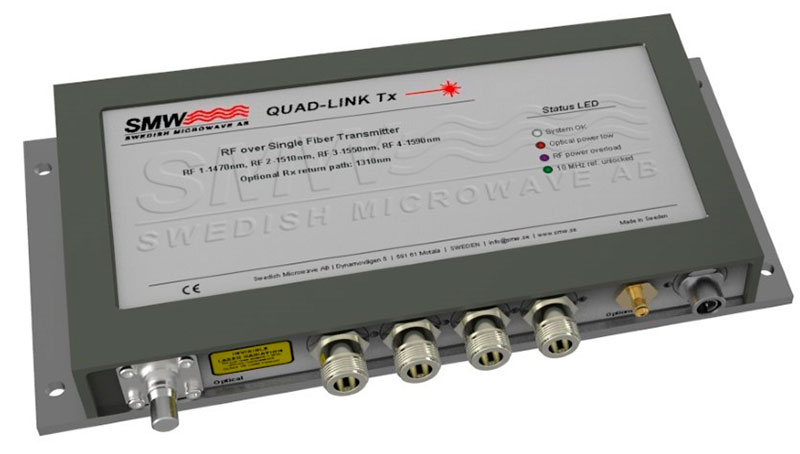 Система SMW Quad-Link состоит из передатчика и приемника наружного всепогодного исполнения, передающих по одному волокну четыре сигнала спутниковой ПЧ 950÷2150 МГц (L-band) с частотным уплотнением на расстояние до 10 км (от антенны до головной станции), и одновременно передают во встречном направлении(от ГС к антенне) сигнал внешнего гетеродина 10 MHz.